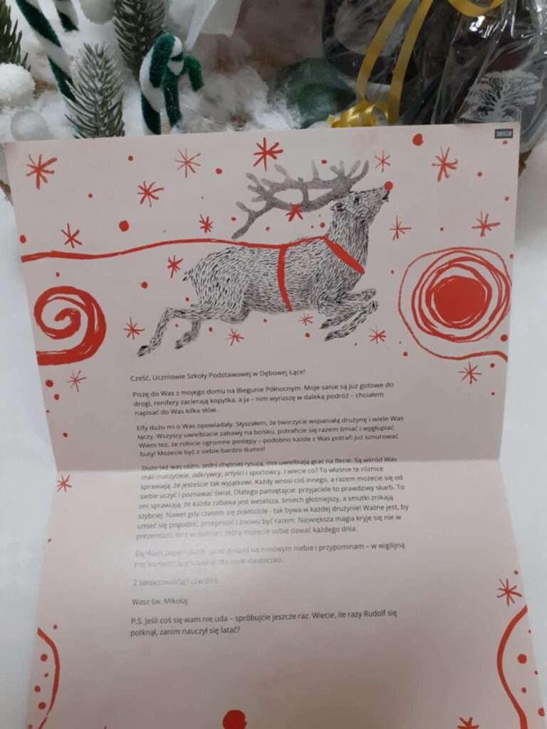 Niezwykłym momentem było odczytanie przez Panią Dyrektor listu od Świętego Mikołaja, który dotarł do nas prosto z Laponii! Mikołaj pochwalił sukcesy naszych uczniów. Podkreślił, że to właśnie różnice między nami sprawiają, że jesteśmy wyjątkowi i każdy wnosi coś innego. Na sam koniec przypomniał, żeby nigdy się nie poddawać. Napisał ” Jeśli coś się Wam nie uda – spróbujcie jeszcze raz.