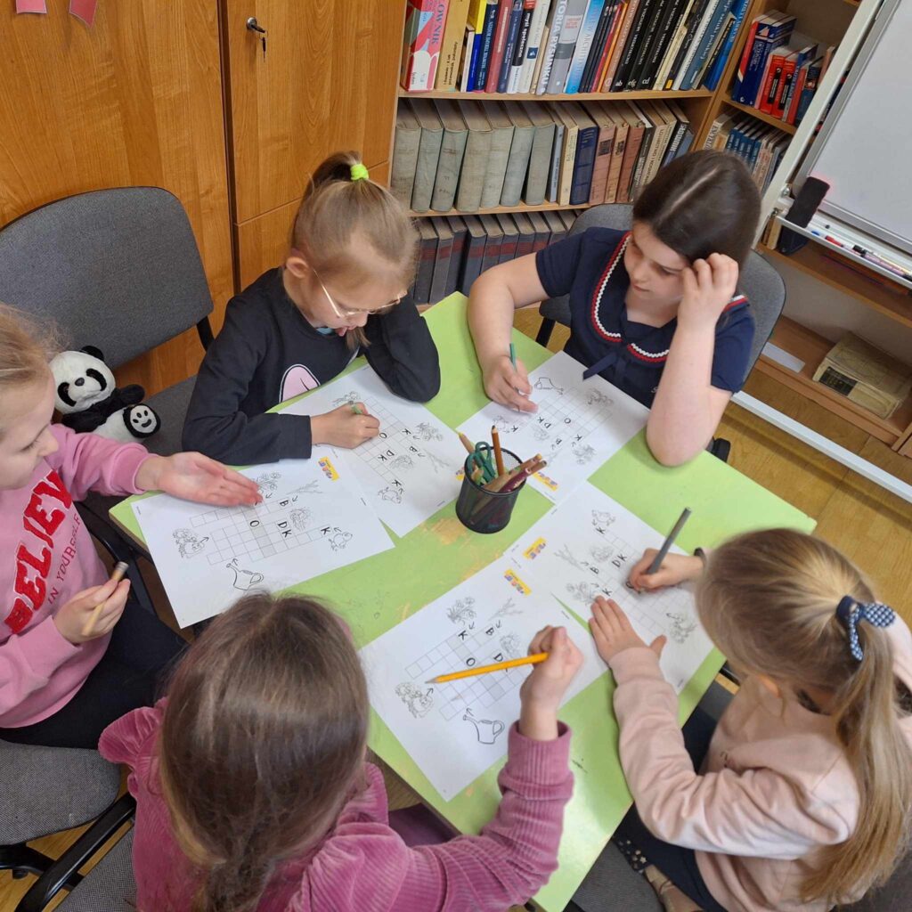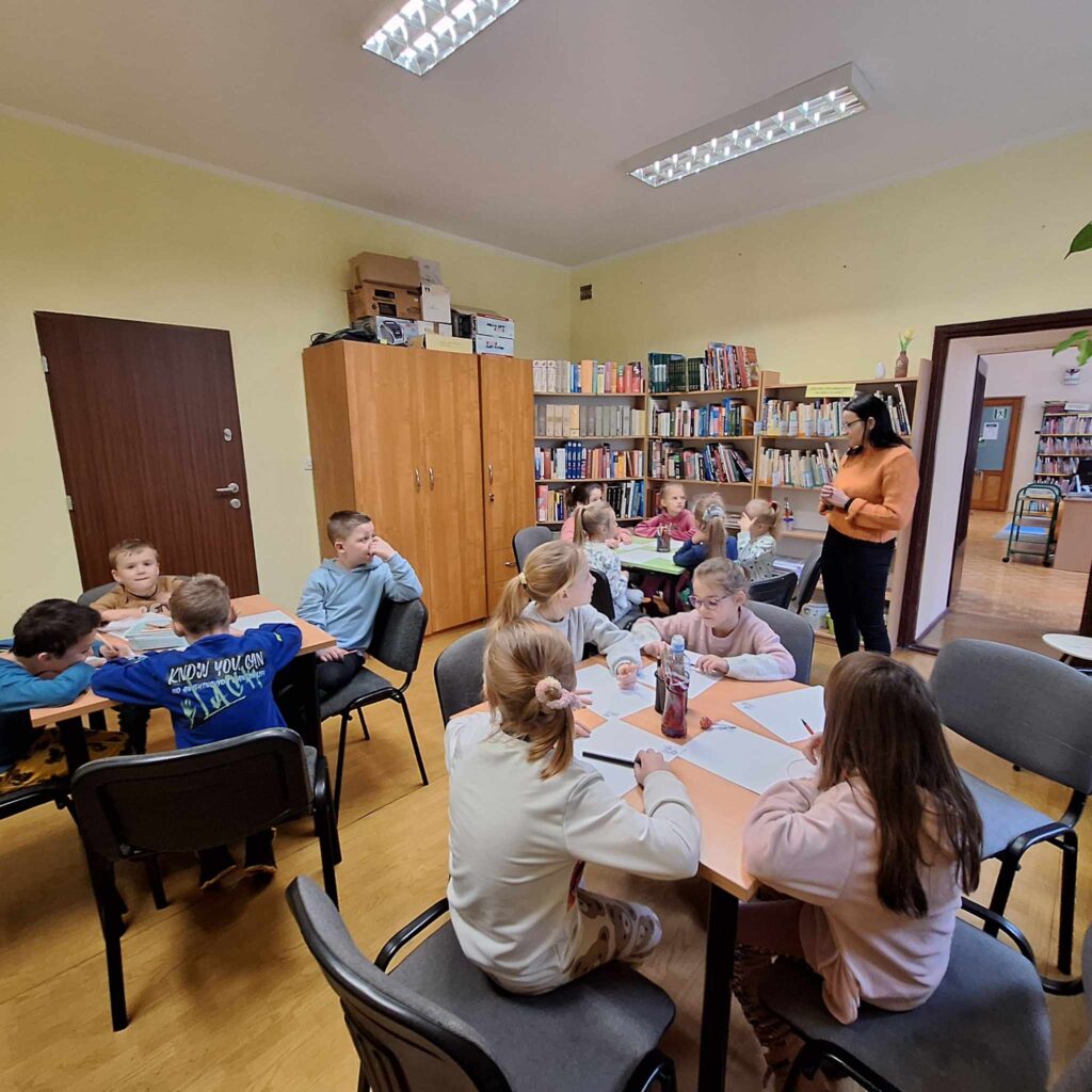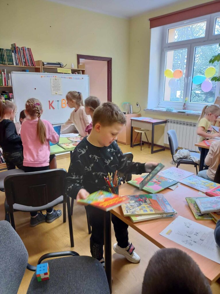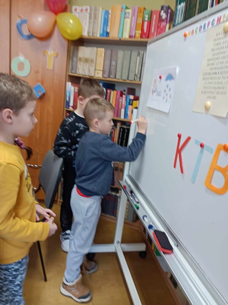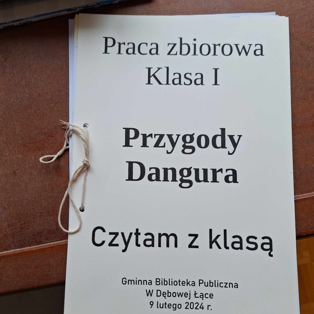 Uczniowie klasy pierwszej wzięli udział w lekcji bibliotecznej w bibliotece gminnej w Dębowej Łące. Uczniowie wysłuchali przygód żółwia Franklina, które przeczytała pani Justyna. Po wysłuchaniu opowieści oraz omówieniu przygód Franklina dzieci wykonały ilustrację na temat ” Przygody Dangura”. Ilustracje zostały zebrane i spięte w naszą pierwszą wspólną książkę. Dzieci wypożyczyły sobie książki na czas odpoczynku w czasie ferii. Dziękujemy pani Justynie za miłe spędzony czas.