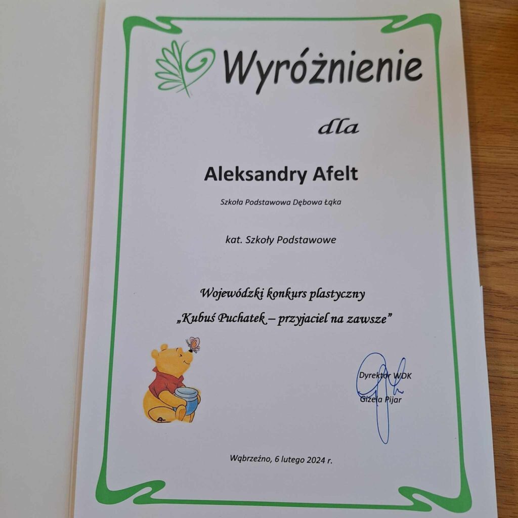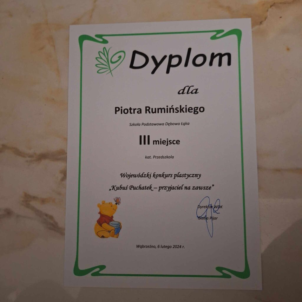 8 lutego w wąbrzeskim Domu Kultury został rozstrzygnięty Wojewódzki Konkurs Plastyczny ” Kubuś Puchatek- przyjaciel na zawsze”. Wśród nagrodzonych dzieci są nasi uczniowie : Aleksandra Afelt, uczennica klasy pierwszej, która zdobyła wyróżnienie w kategorii Szkoły Podstawowe oraz Piotr Rumiński, przedszkolak, który zdobył 3 miejsce w kategorii Przedszkole. Dzieciom gratulujemy i życzymy dalszych sukcesów.