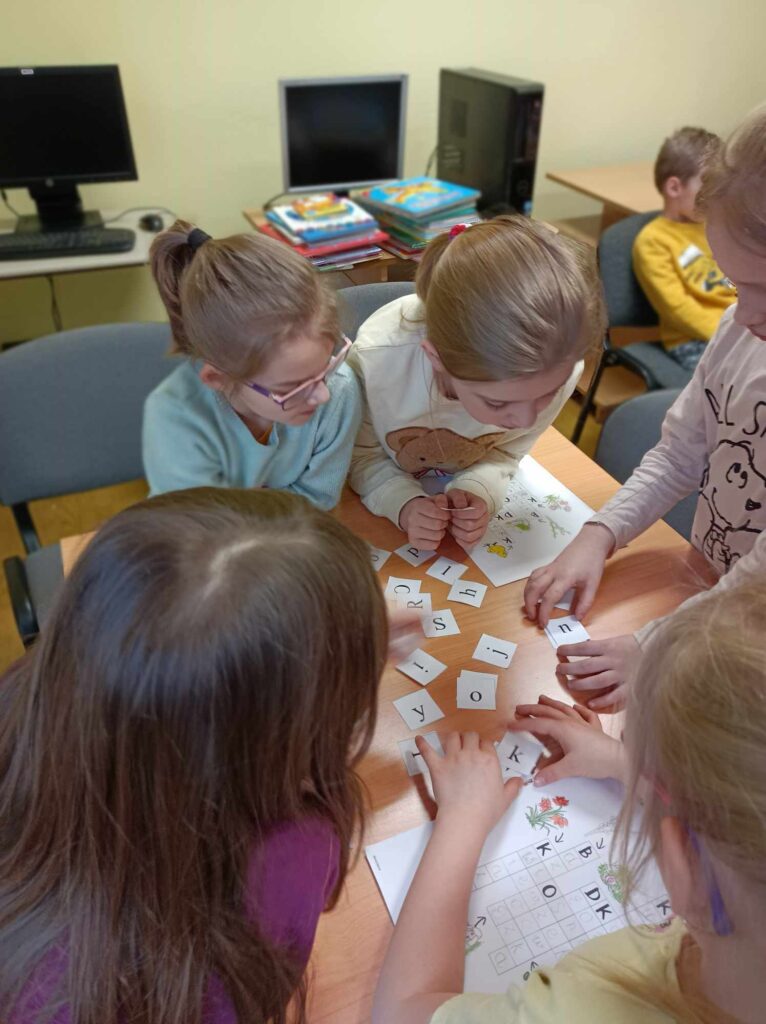 Uczniowie klasy pierwszej po raz kolejny, w ramach comiesięcznych zajęć bibliotecznych, odwiedzili Gminną Publiczną Bibliotekę w Dębowej Łące. Dzieci zapoznały się z definicją literatury belarystycznej i niebelarystycznej. Tym razem korzystały z pozycji książkowych dotyczących tego drugiego zagadnienia. Poszukiwali wiadomości dotyczących zwiastunów wiosny oraz wiosny w całej swojej pięknej okazałości. Na podstawie poznanych wiadomości dzieci, pracując w trzech grupach, wykonały kolaż pt. WIOSNA. Prace zabraliśmy do klasy, aby zawisły na naszej klasowej gazetce. Dziękujemy Pani Justynie za kolejne, bardzo miłe spotkanie oraz za zorganizowanie zajęć.
