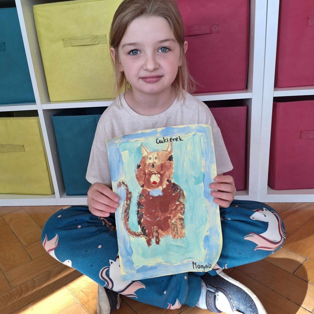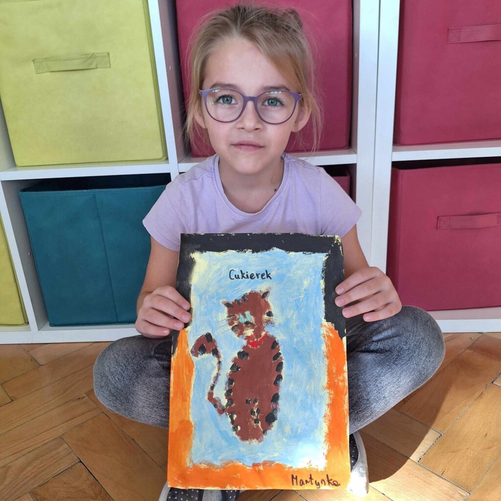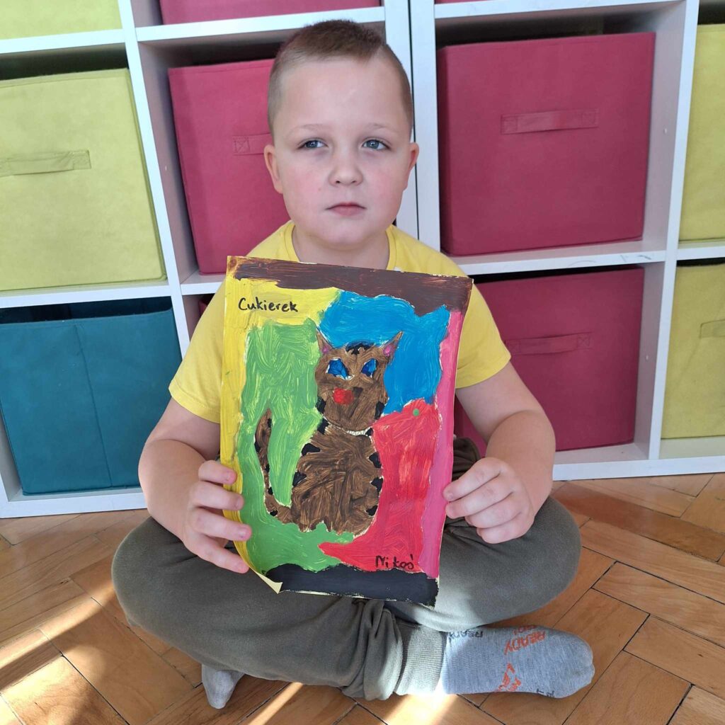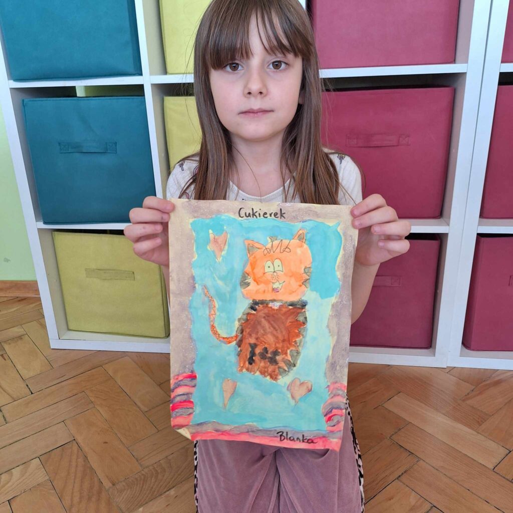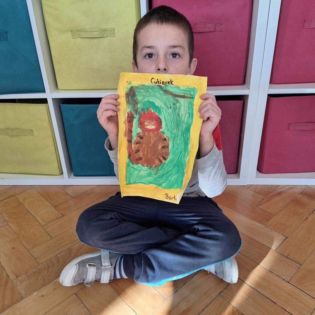 Uczniowie klasy pierwszej wykonali piękne prace plastyczne przedstawiające głównego bohatera lektury „Cukierku, ty łobuzie”.