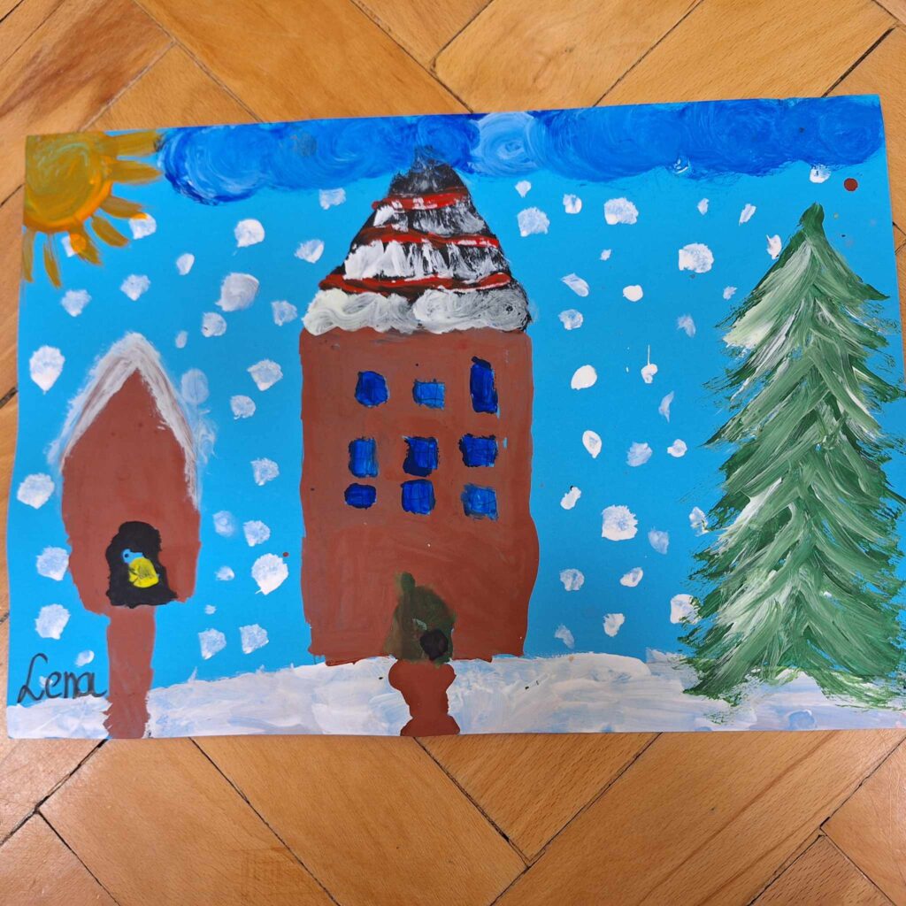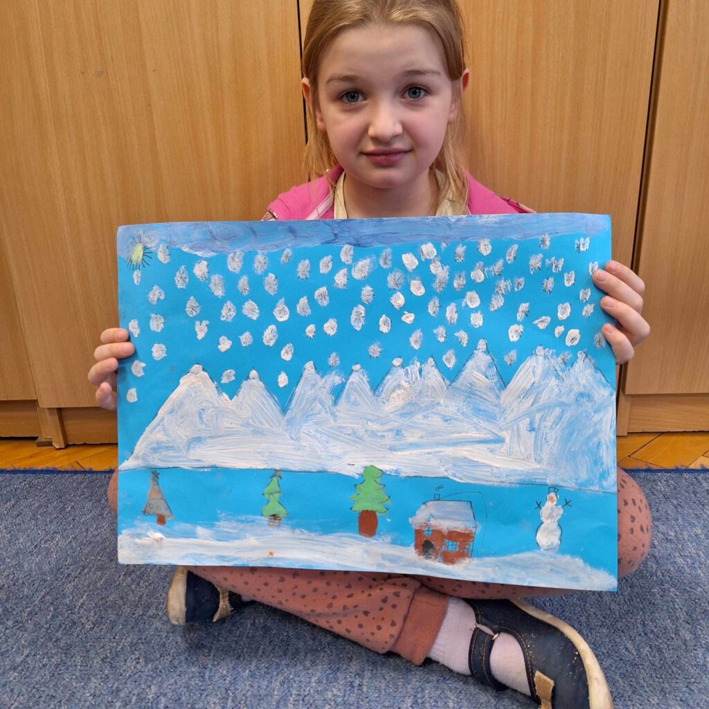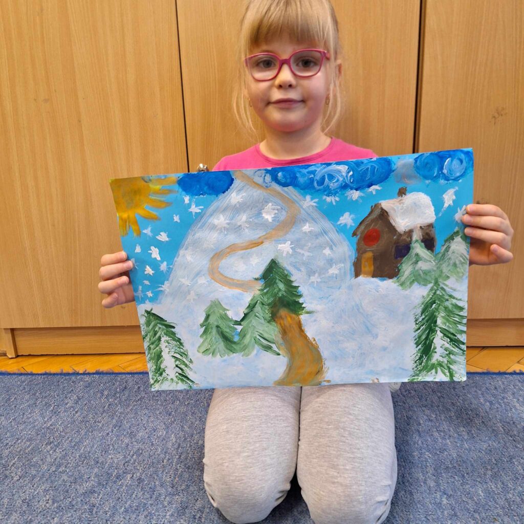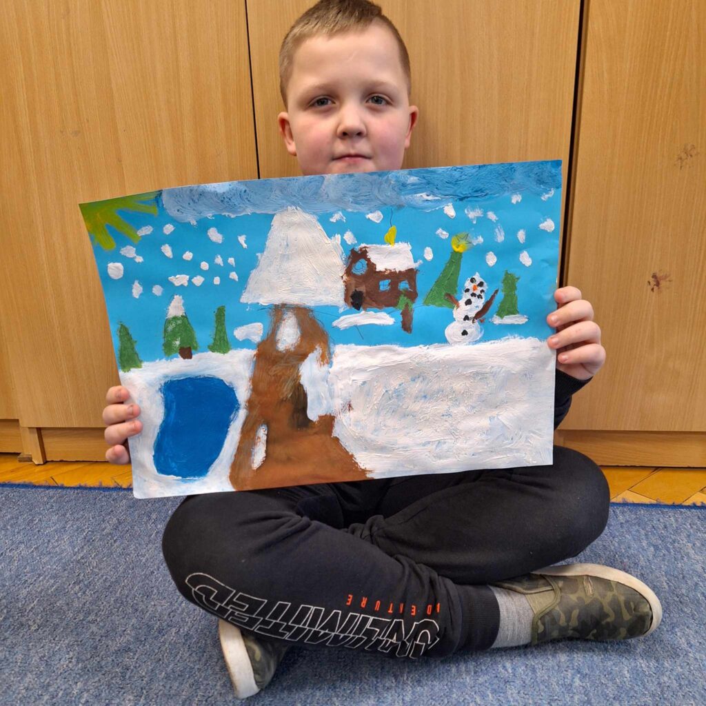 Uczniowie klasy pierwszej wykonali piękne pracę plastyczne przedstawiające zimową aurę.