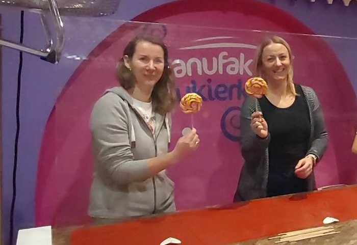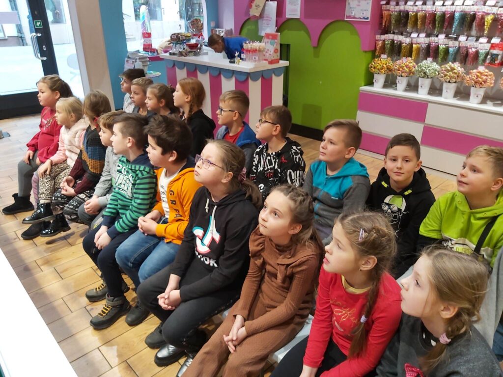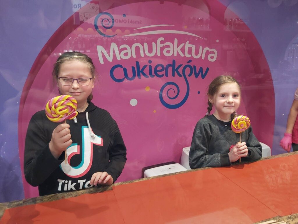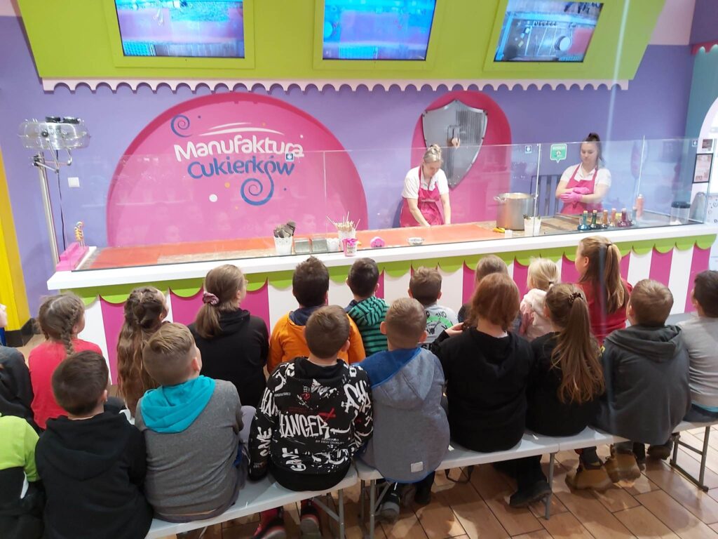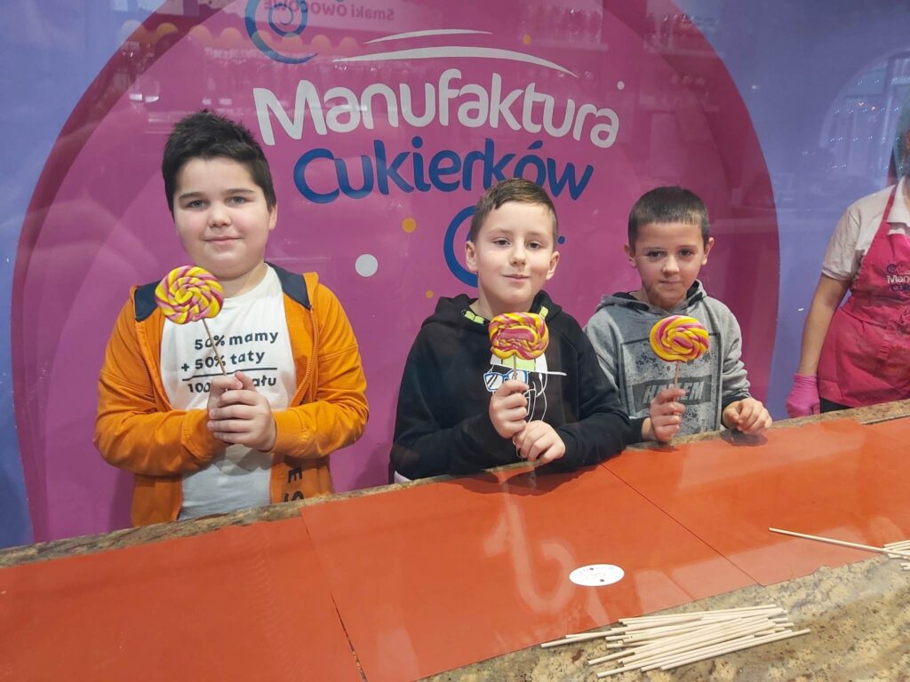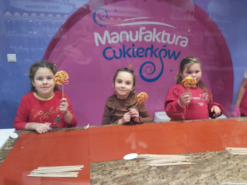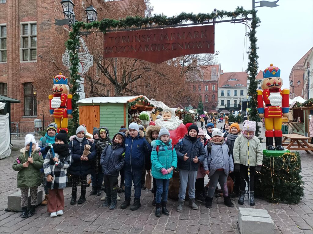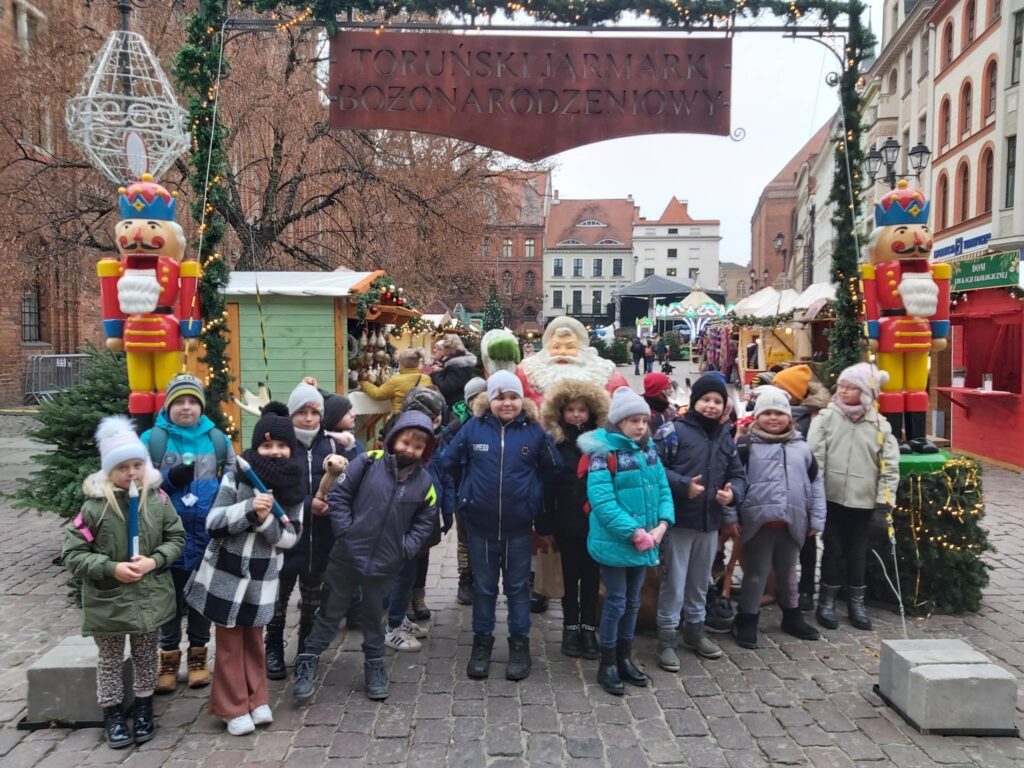 Drugiego grudnia o godzinie 8.00 spotkaliśmy się z naszymi wychowawczyniami- Panią Moniką Piątek – Pokucińską oraz Panią Aleksandrą Gutmańską – Rumińską na dworcu PKP Wąbrzeźno. Nad naszym bezpieczeństwem czuwali także Pani Paulina Chotkowska oraz Pan Krzysztof Zasada. Pociąg nadjechał punktualnie i już o 8.16 zajęliśmy miejsca siedzące w pociągu. Emocji było co niemiara, gdyż dla wielu z nas była to pierwsza w życiu podróż pociągiem. Na stację Toruń – Miasto przybyliśmy nawet kilka minut wcześniej niż było to przewidziane i ruszyliśmy w stronę Planetarium. Po drodze odwiedziliśmy Jarmark Świąteczny i podziwialiśmy przepięknie ozdobione miasto. W Planetarium dowiedzieliśmy się wielu mądrych i interesujących rzeczy dotyczących naszego globu i kosmosu biorąc udział w seansie pt.”Renifer Kometa”. Następnym punktem naszej wycieczki były zajęcia w Manufakturze Cukierków. Tam poznaliśmy tajniki tworzenia cukierków ręcznie robionych i sami mogliśmy zrobić dla siebie takiego słodkiego, kolorowego lizaka. Nasze panie i opiekunowie także wzięli udział w tej zabawie. Po zajęciach i degustacji słodkich cukiereczków nadszedł czas na lunch. Oczywiście nigdzie indziej, tylko w restauracji MC Donald’s. Wycieczka zawsze jest udana jeśli posiłek jest w restauracji MC Donald’s. Odpoczęliśmy troszkę, napełniliśmy brzuszki. Ostatnim punktem naszej wycieczki były zakupy w sklepie Flying Tiger, gdzie było mnóstwo różnych gadgetów i każdy znalazł coś odpowiedniego dla siebie. Jeszcze spacerek po Starówce Torunia pod Krzywą Wierzę i powolutku ruszyliśmy w kierunku Stacji Toruń – Miasto. O 15.27 nadjechał nasz pociąg, w którym było mnóstwo ludzi i tym razem już nie było szans na zajęcie miejsc siedzących. Nasze panie zgodnie przyznały, że musimy poznać na własnej skórze różne warunki podróżowania, bo nie zawsze są miejsca wolne, pomimo wykupienia biletów. Cali i zdrowi, troszeczkę zmęczeni, ale podekscytowani piątkową wyprawą wróciliśmy do naszych domków. Bardzo dziękujemy naszym paniom za zorganizowanie tej wycieczki oraz opiekunom za czuwaniem, aby wszystko przebiegło sprawnie i bezpiecznie.
