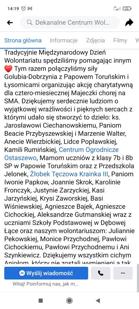 Majka ma 3 miesiące i od urodzenia choruje na rdzeniowy zanik mięśni. To śmiertelna choroba i pomóc Majce może tylko najdroższy lek świata. Chcemy pomóc Majce i jej rodzicom. Organizujemy zbiórkę przetworów, które przekazane zostaną na kiermasz w Golubiu – Dobrzyniu, a pieniądze zebrane na kiermaszu zostaną przeznaczone na lek dla Majki.