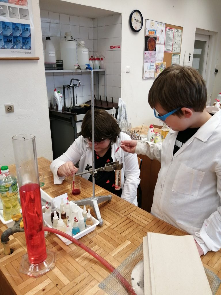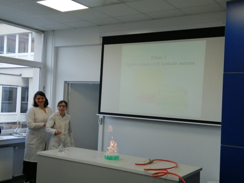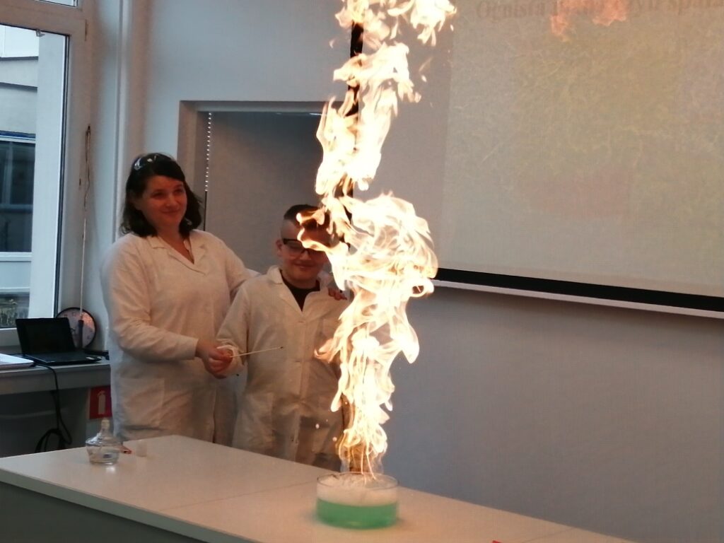 W podróż wyruszyliśmy wcześnie, bo już o godzinie 7.30. Na miejscu przywitała nas p. Agata Szumera, z którą udaliśmy się do pracowni chemicznej. Przed przystąpieniem do zajęć uczniowie już mogli poczuć się jak „mali chemicy”, gdy przebrali się w fartuchy i okulary ochronne. Pani Agata zapoznała ich z zasadami obowiązującymi w pracowni. Po krótkim szkoleniu można było przystąpić do zajęć. Od samego początku emocji było co niemiara zwłaszcza, że dla uczniów klasy szóstej było to pierwsze zetknięcie z prawdziwym laboratorium chemicznym. Uczniowie mogli samodzielnie wykonywać doświadczenia np. „kociołek czarownicy”, wyprodukować sztuczną krew, czy zrobić kolorową pianę. Były kolory, była para, suchy lód, ogień i wybuchy. Te bardziej spektakularne doświadczenia wykonywane były przez panią Agatę np. „pasta dla słonia” czy „paląca się podłoga”, która była dużym zaskoczeniem dla naszych młodych naukowców (wszystko oczywiście było zamierzone i kontrolowane przez prowadzącą zajęcia).