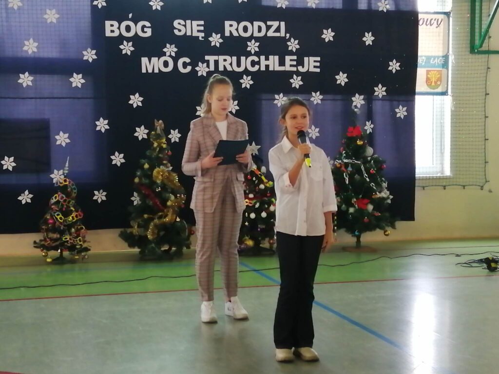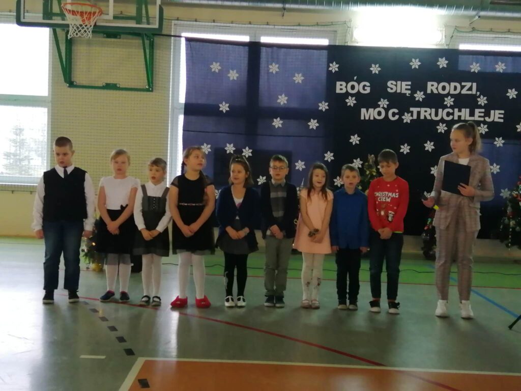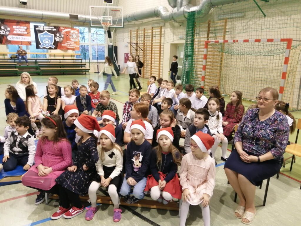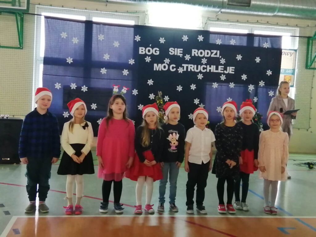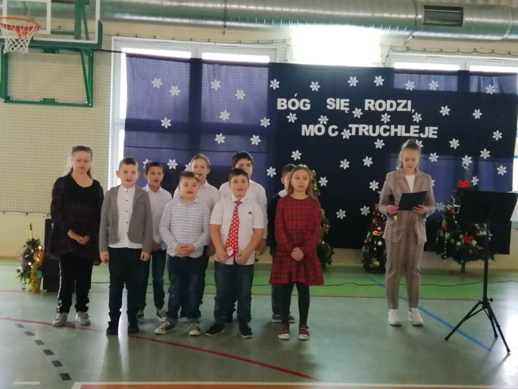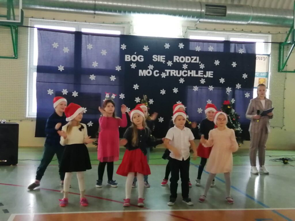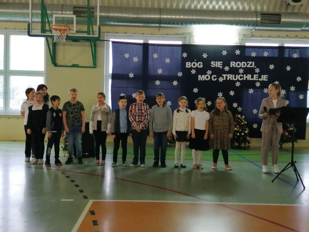 W czasie „Świątecznego kolędowania” rozpromieniły twarze wszystkich przybyłych uczniów, nauczycieli i pracowników szkoły .Dnia 22 grudnia 2022 r. w hali sportowej odbył się Koncert Kolęd. Na scenie stanęli uczniowie klasy od zerówki do ósmej . Pan Tomasz Składanowski, który dyrygował szkolną grupą kolędniczą. Wśród wykonanych utworów znalazły się tradycyjne, polskie kolędy oraz piosenki świąteczne. Utwory urzekały różnorodnością interpretacji i subtelnością wykonania. Wszyscy zgodnie twierdzili, że kolędowanie, będące już stałym elementem tradycji naszej szkoły, pozwala poczuć magię świąt. Któż bowiem potrafi oprzeć się atmosferze Bożego Narodzenia? Zapach choinki, blask świec, ciepło muzyki sprawiają, że stajemy się lepsi, wrażliwsi i bardziej uważni na los drugiego człowieka.