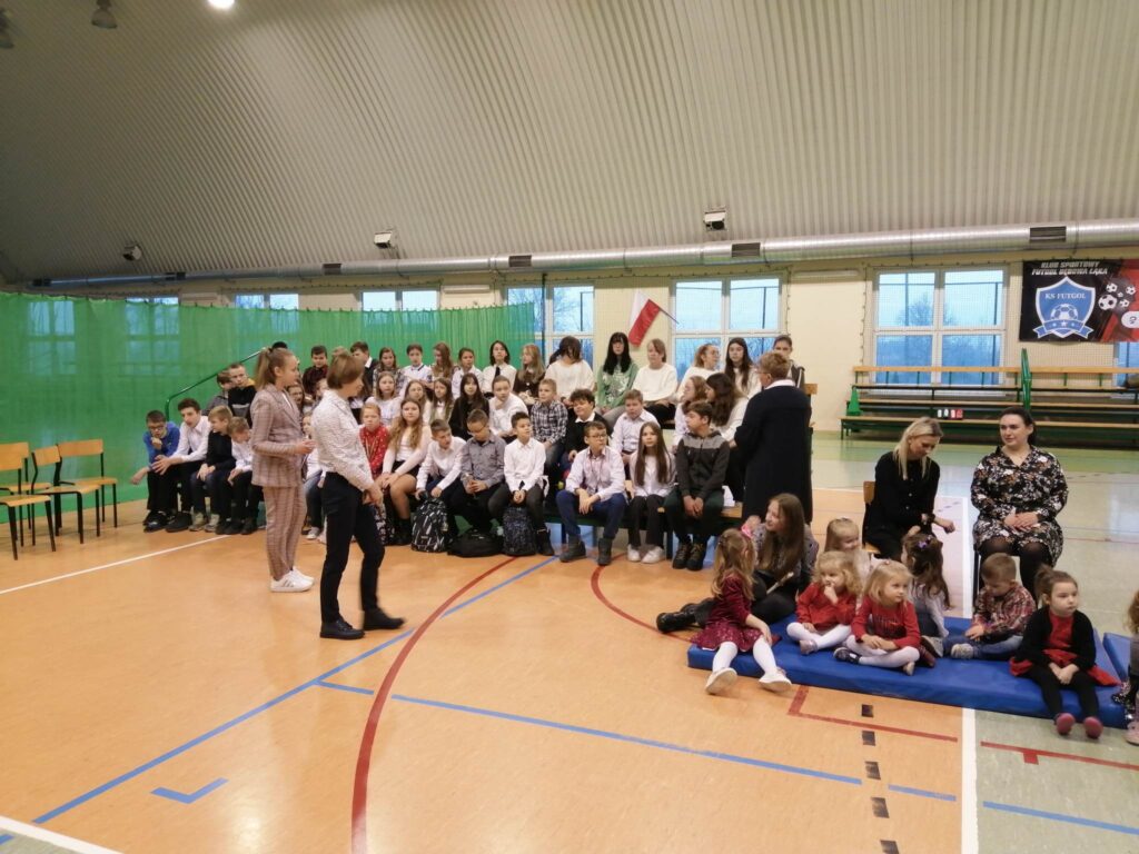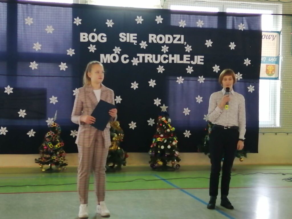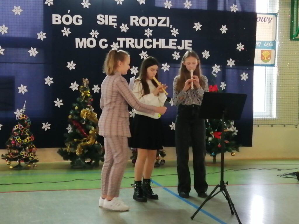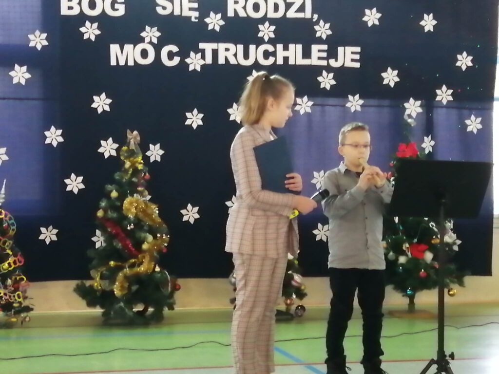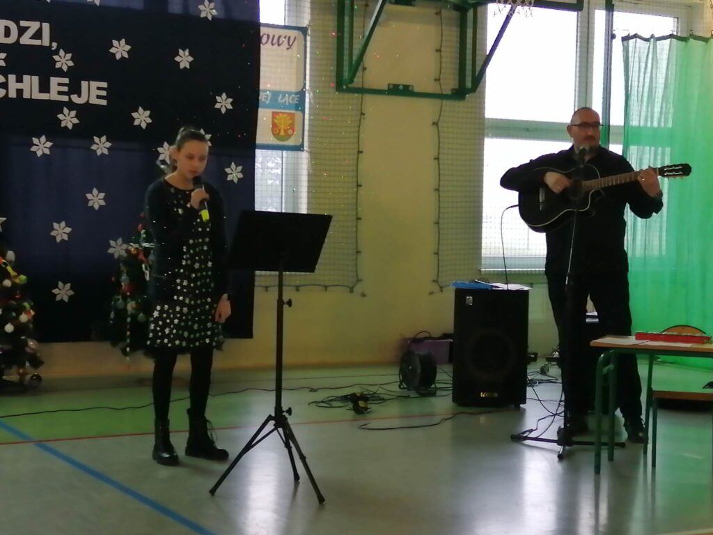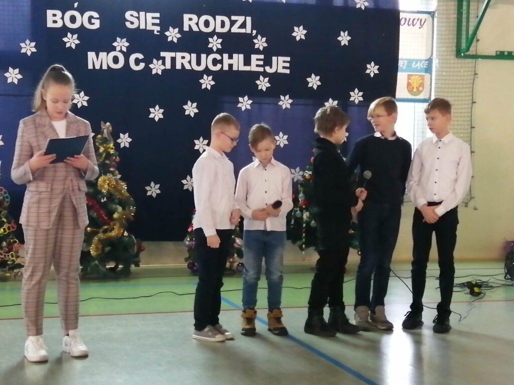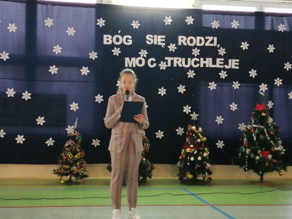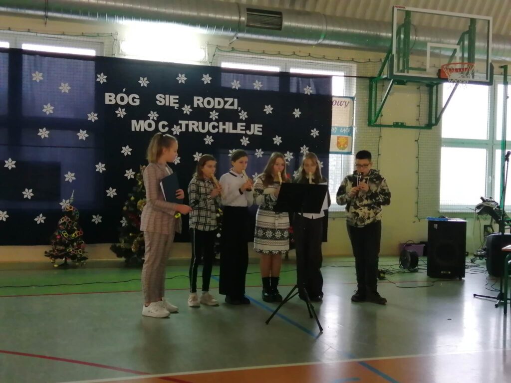 W czasie „Świątecznego kolędowania” rozpromieniły twarze wszystkich przybyłych uczniów, nauczycieli i pracowników szkoły .Dnia 22 grudnia 2022 r. w hali sportowej odbył się Koncert Kolęd. Na scenie stanęli uczniowie klasy od zerówki do ósmej . Pan Tomasz Składanowski, który dyrygował szkolną grupą kolędniczą. Wśród wykonanych utworów znalazły się tradycyjne, polskie kolędy oraz piosenki świąteczne. Utwory urzekały różnorodnością interpretacji i subtelnością wykonania. Wszyscy zgodnie twierdzili, że kolędowanie, będące już stałym elementem tradycji naszej szkoły, pozwala poczuć magię świąt. Któż bowiem potrafi oprzeć się atmosferze Bożego Narodzenia? Zapach choinki, blask świec, ciepło muzyki sprawiają, że stajemy się lepsi, wrażliwsi i bardziej uważni na los drugiego człowieka.
