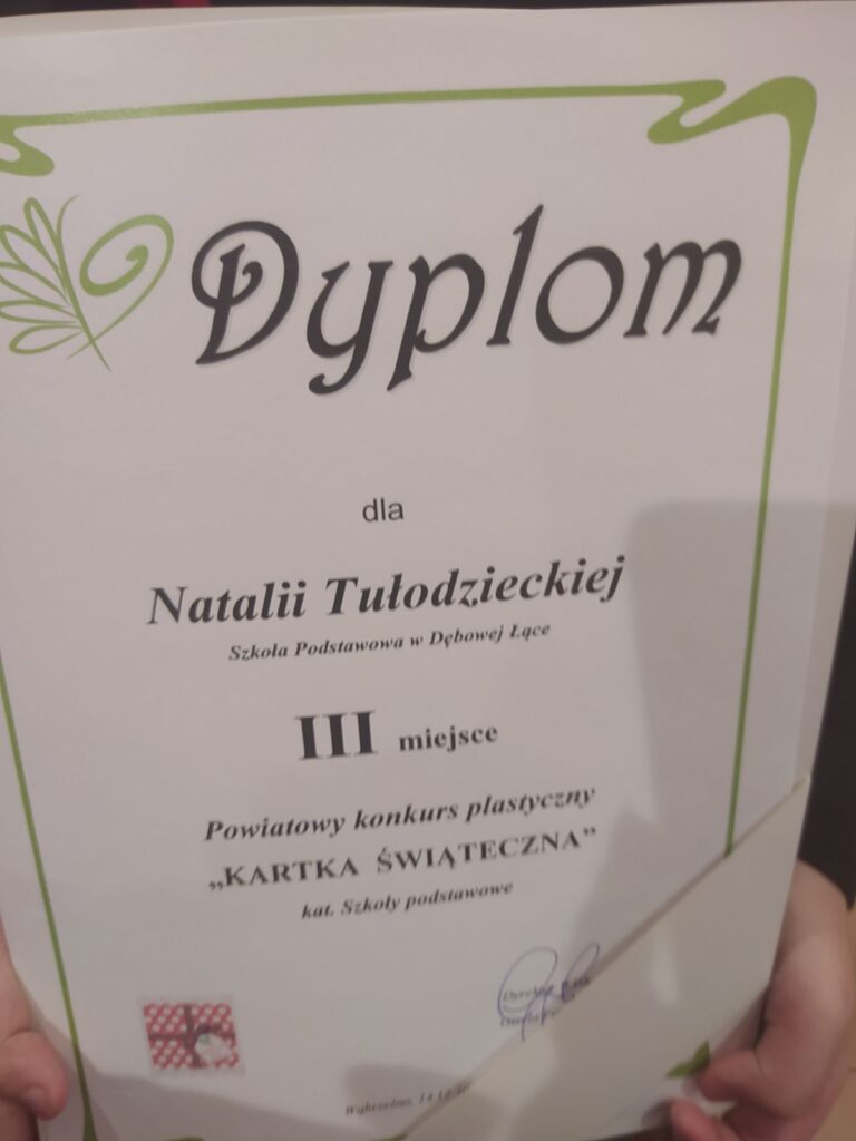 Nasza uczennica Natalia Tułodziecka zdobyła III miejsce w Powiatowym konkursie plastycznym „Kartka Świąteczna”. Gratulujemy!