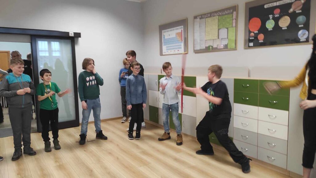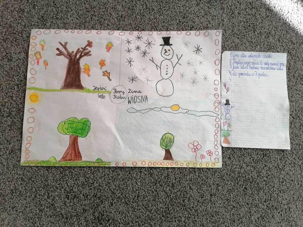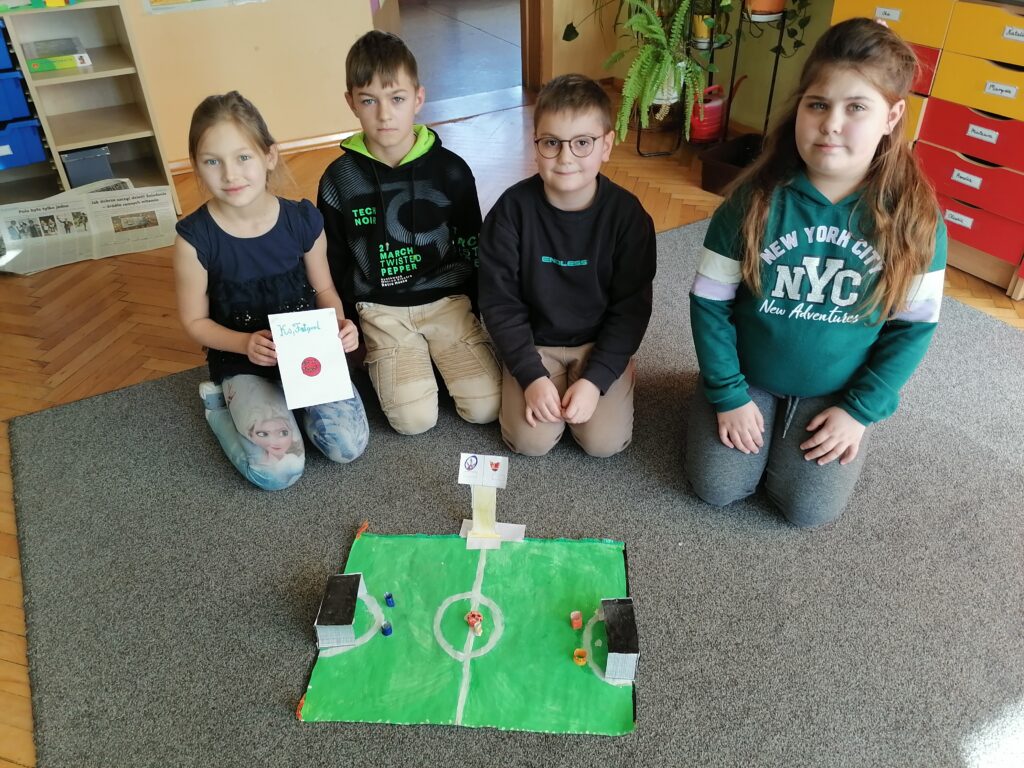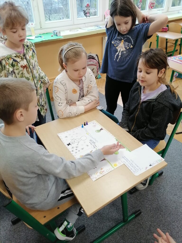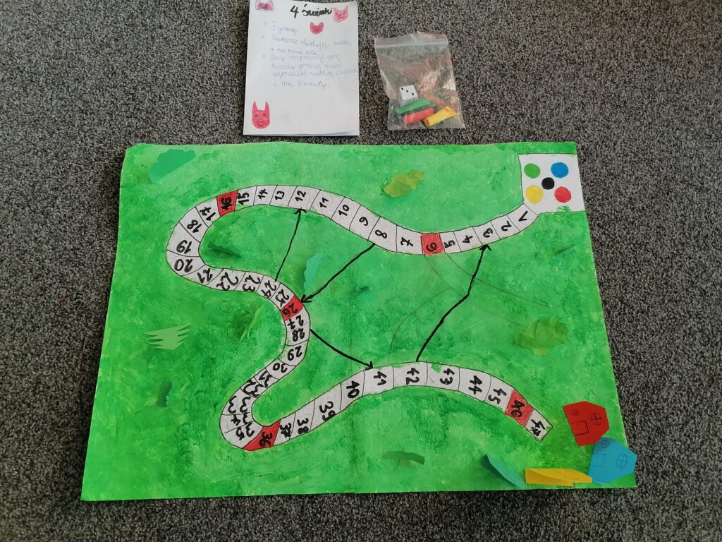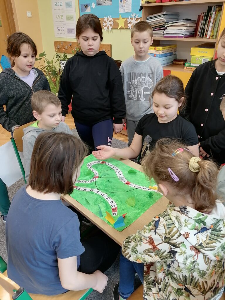 Uczniowie klasy drugiej zaprojektowali oraz wykonali gry planszowe. Dzieci pracowały w grupach metodą projektu. W ten sposób miały możliwość doskonalenia sprawności manualnej i konstrukcyjnej. Każda grupa wymyśliła i spisała zasady swojej gry. Poszczególne zespoły zaprezentowały na forum klasy wykonane przez siebie projekty, a następnie grały okazując radość i pozytywne emocje podczas zabawy.