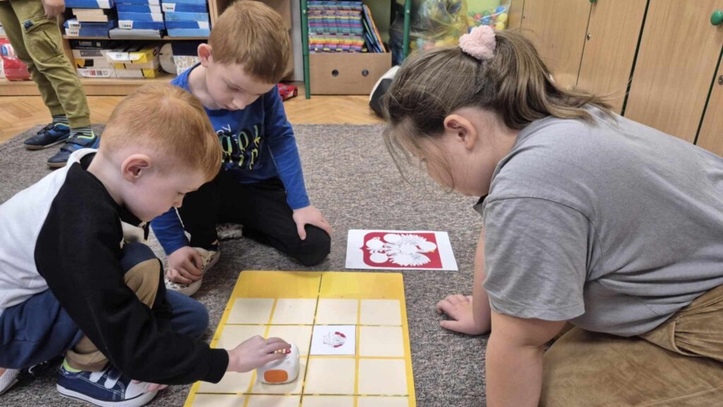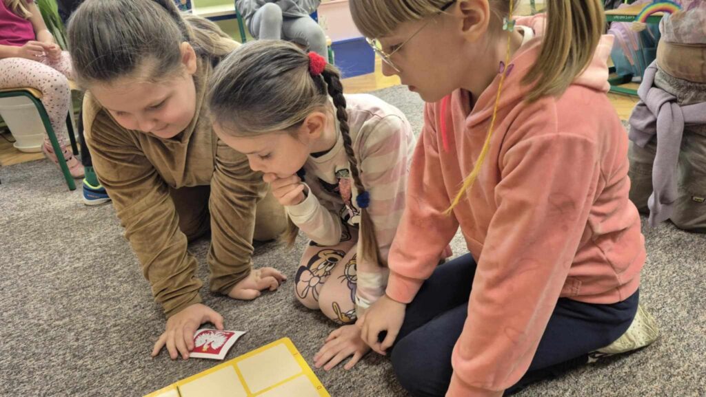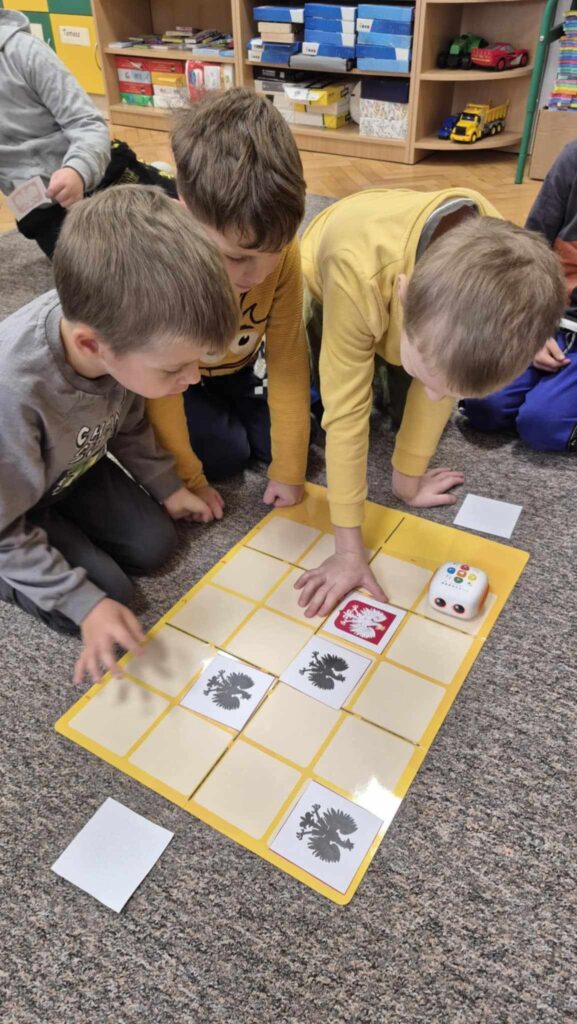 Jak zawsze wykonaliśmy szereg zadań. Na tablicy multimedialnej graliśmy w memory oraz rozwiązywaliśmy quiz o Polsce. Tworzyliśmy też nasze godło oraz odnajdowaliśmy cienie orłów na planszy do kodowania.